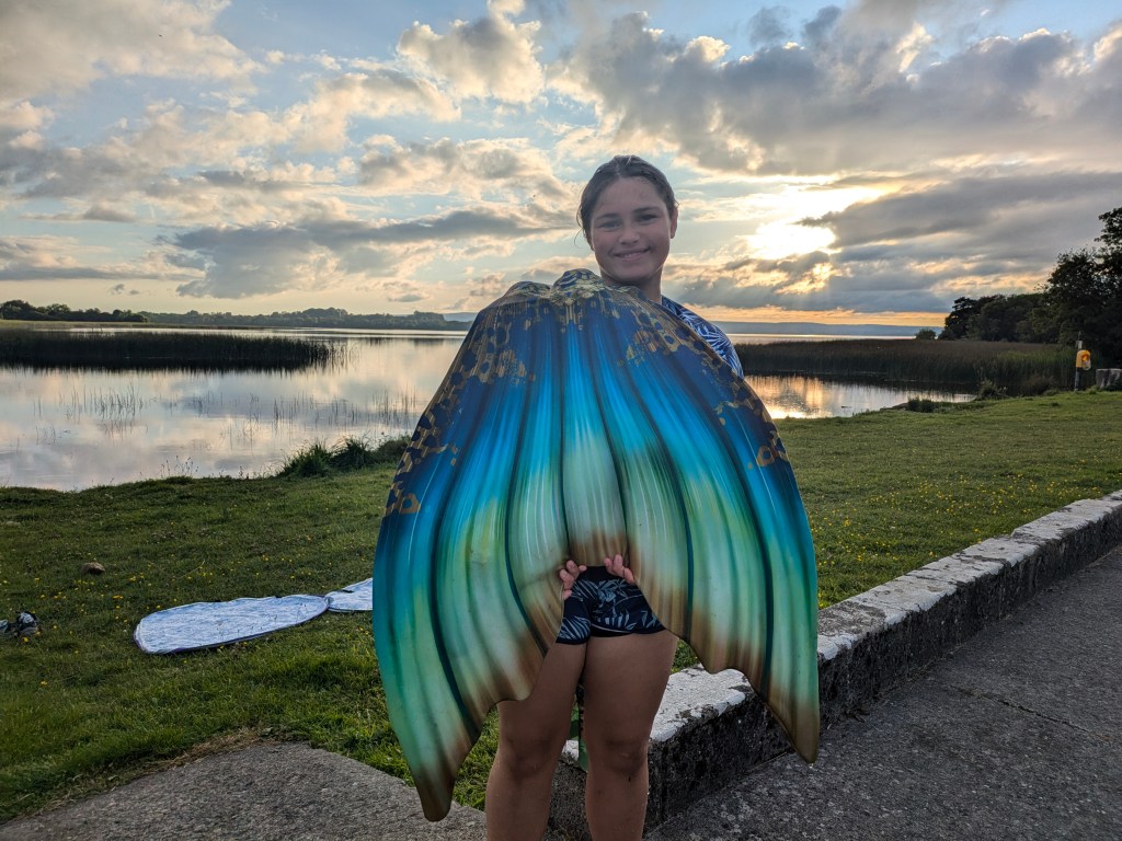 Aobha me respondió: «Esta es mi cola de sirena que uso desde hace años, hasta que pueda adquirir la cola profesional.» «¿Cola de sirena profesional?» pregunté. «Sí, así puedo ser sirena cuando sea grande…». Ser sirena cuando sea grande, con una cola profesional… Sentada en la costa atlántica irlandesa entre viento y acantilados, algo resonó profundamente en mí con su sólida respuesta.