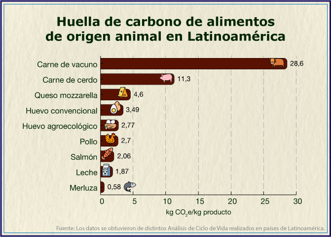 Nos han dicho que la carne de vacuno tiene una huella de carbono muy alta y nos piden que nos hagamos todos vegetarianos para ayudar a limitar el cambio climático. ¿Pero qué tan alta es y cómo se compara con otras fuentes de proteína animal? Vamos entonces directo al hueso: en el siguiente gráfico te muestro los resultados de análisis de ciclos de vida hechos en Latinoamérica para distintos alimentos de origen animal: