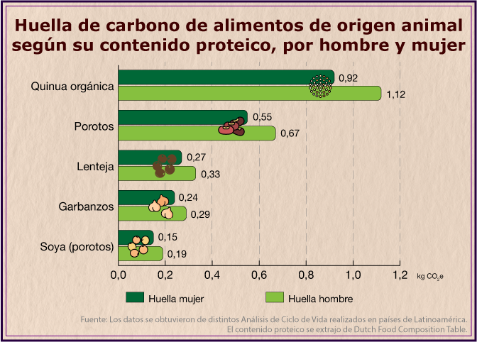 Sin embargo, aquí hay un detalle importante: si se fijan, cuando se consideran las proteínas la huella de la quinua para los hombres aumenta en relación al valor presentado en la tabla anterior. Esto se debe a su bajo contenido proteico, lo que te obligaría a comerte más de un kilo de quinua si quisieras obtener todas tus proteínas solo de ese alimento.